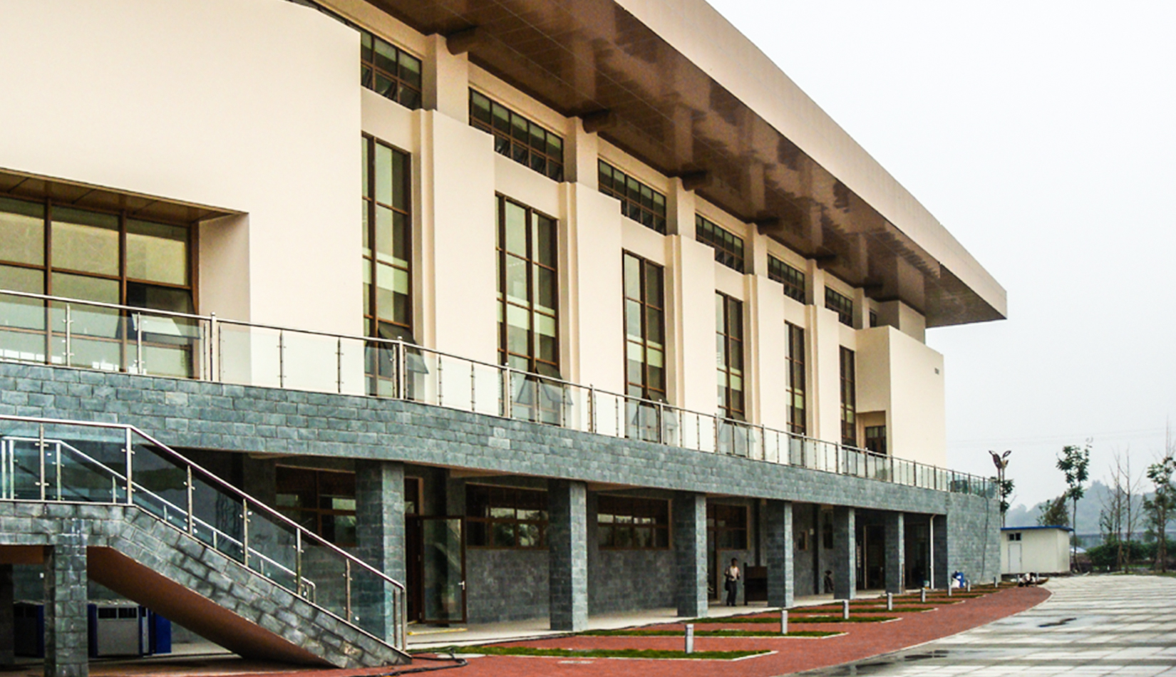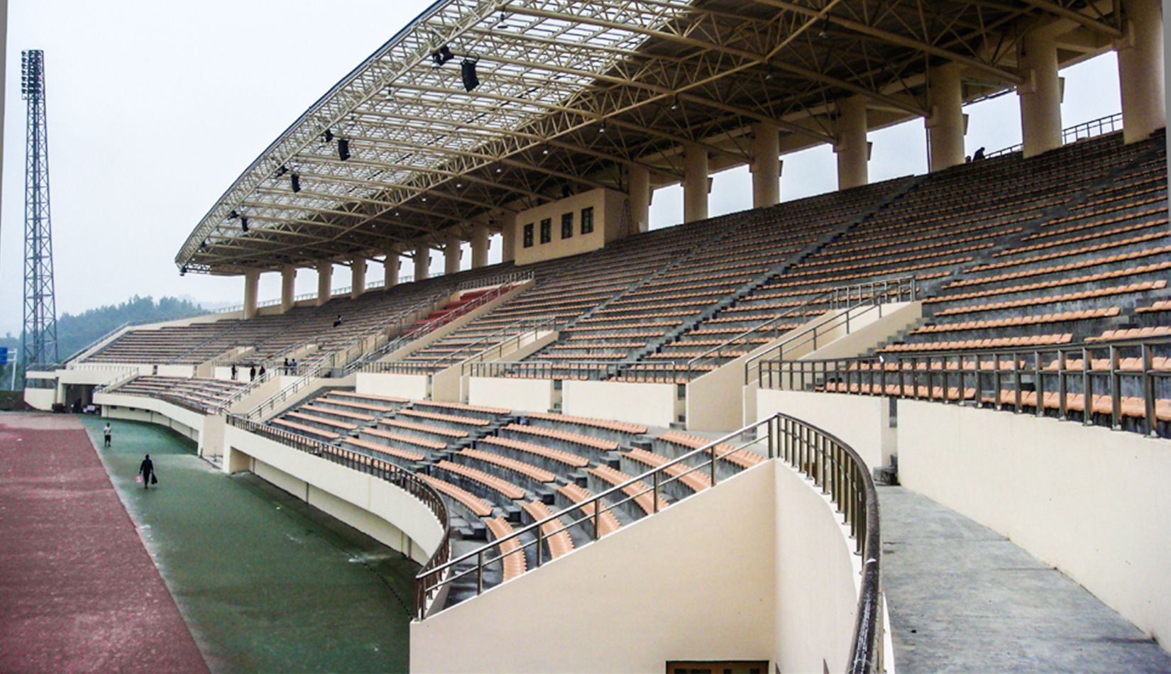 北川羌族自治縣體育中心位于新縣城南端的95 號(hào)街坊內(nèi),用地面積5.6 公頃,現(xiàn)狀地形平坦。北側(cè)為濱河路,毗鄰永昌河公園景觀帶,西側(cè)為禹龍路,隔路與安昌河相望,東側(cè)為貫穿新縣城的交通干道- 齊魯大道,用地四周環(huán)路,交通便利,地處北川新縣城的南門戶,是進(jìn)入縣城的標(biāo)志性建筑。