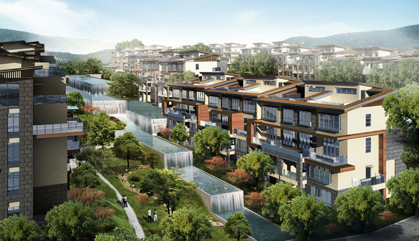 在總體的規(guī)劃設(shè)計(jì)中,設(shè)計(jì)師的靈感主要來源于項(xiàng)目中現(xiàn)存的分布于場(chǎng)地中央和南北地塊的數(shù)處面積不大但卻別具自然風(fēng)情的水體和山頂雨水沖刷所形成的沖溝。