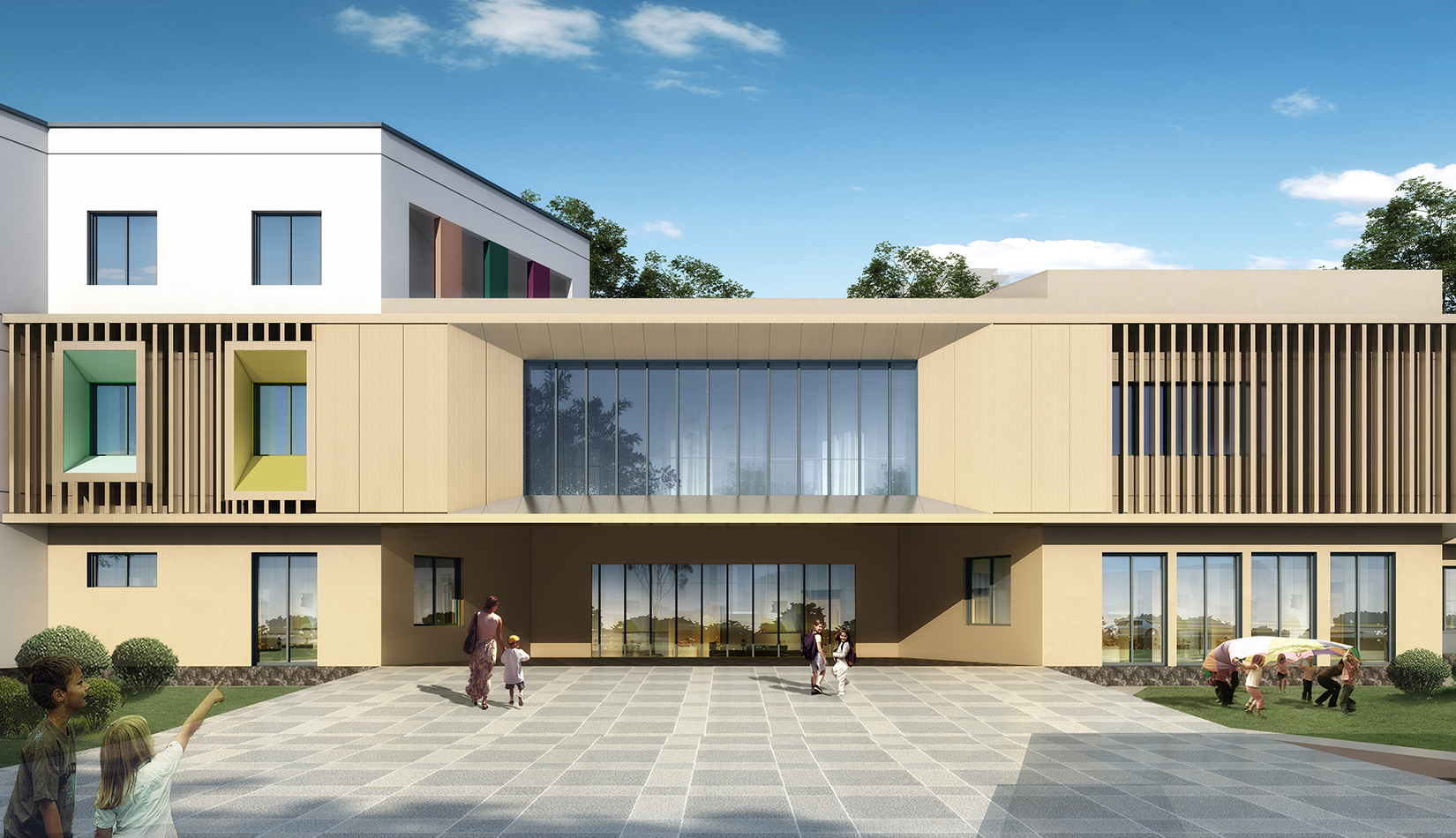 整體建筑以暖色調(diào)為主,旨在為幼兒營(yíng)造一種溫馨的環(huán)境氛圍,以紅色陶土板為基調(diào),與周邊古典風(fēng)格的住宅區(qū)相融合。彩色的運(yùn)用象征著孩子活潑多彩的個(gè)性,迎合了孩子對(duì)色彩的敏感特性,營(yíng)造出一種五彩斑斕的活潑的環(huán)境氛圍;彩色具有強(qiáng)調(diào)作用,可以突出建筑作為幼兒園的功能性,同時(shí)白色作為整體環(huán)境的基調(diào)色,協(xié)調(diào)了不同色彩間的沖突感受,使建筑氛圍呈現(xiàn)簡(jiǎn)潔明凈而又突顯夢(mèng)幻的特點(diǎn)。