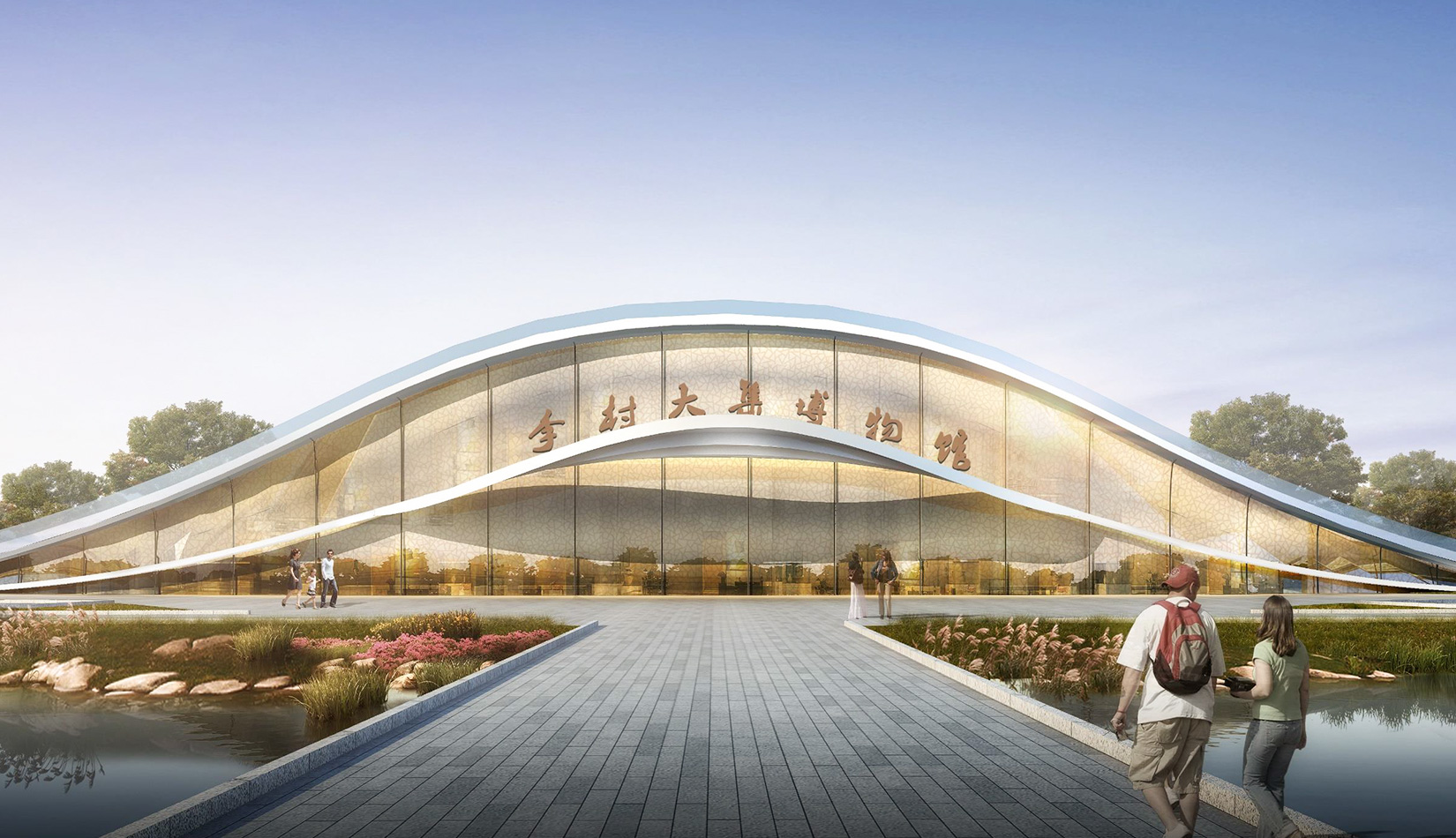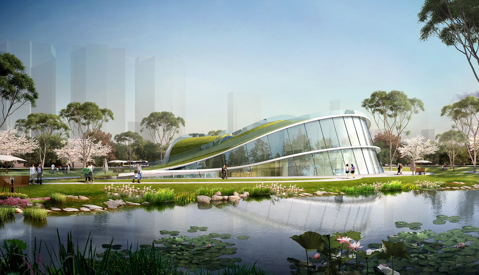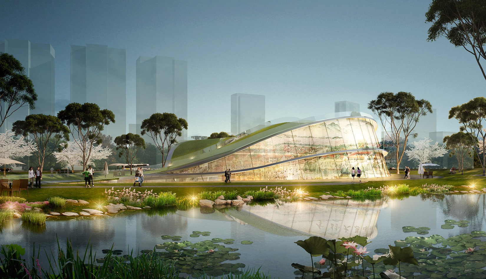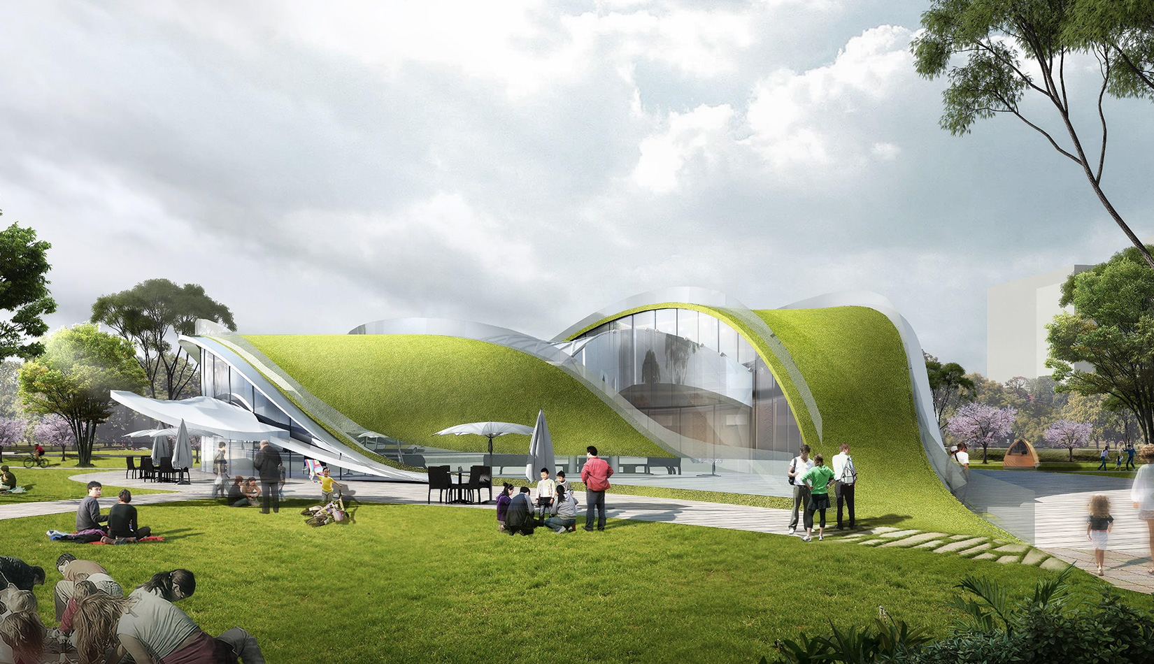 該項(xiàng)目基地位于濱河公園內(nèi),目標(biāo)要將博物館打造成一個(gè)生態(tài)建筑,建筑能與環(huán)境有機(jī)融合。在這一理念下,將博物館設(shè)計(jì)為樹葉形,建筑猶如一片樹葉飄落在公園內(nèi),以此體現(xiàn)建筑與環(huán)境的融合。將樹葉形建筑設(shè)計(jì)為覆土建筑,最大程度還原基地一片綠色,以此呼應(yīng)李村大集的“還原”內(nèi)涵。通過(guò)設(shè)計(jì)兩個(gè)曲線形體相互交融形成建筑的最終體量,以此體現(xiàn)相逢意蘊(yùn),呼應(yīng)李村大集的“相逢”內(nèi)涵。