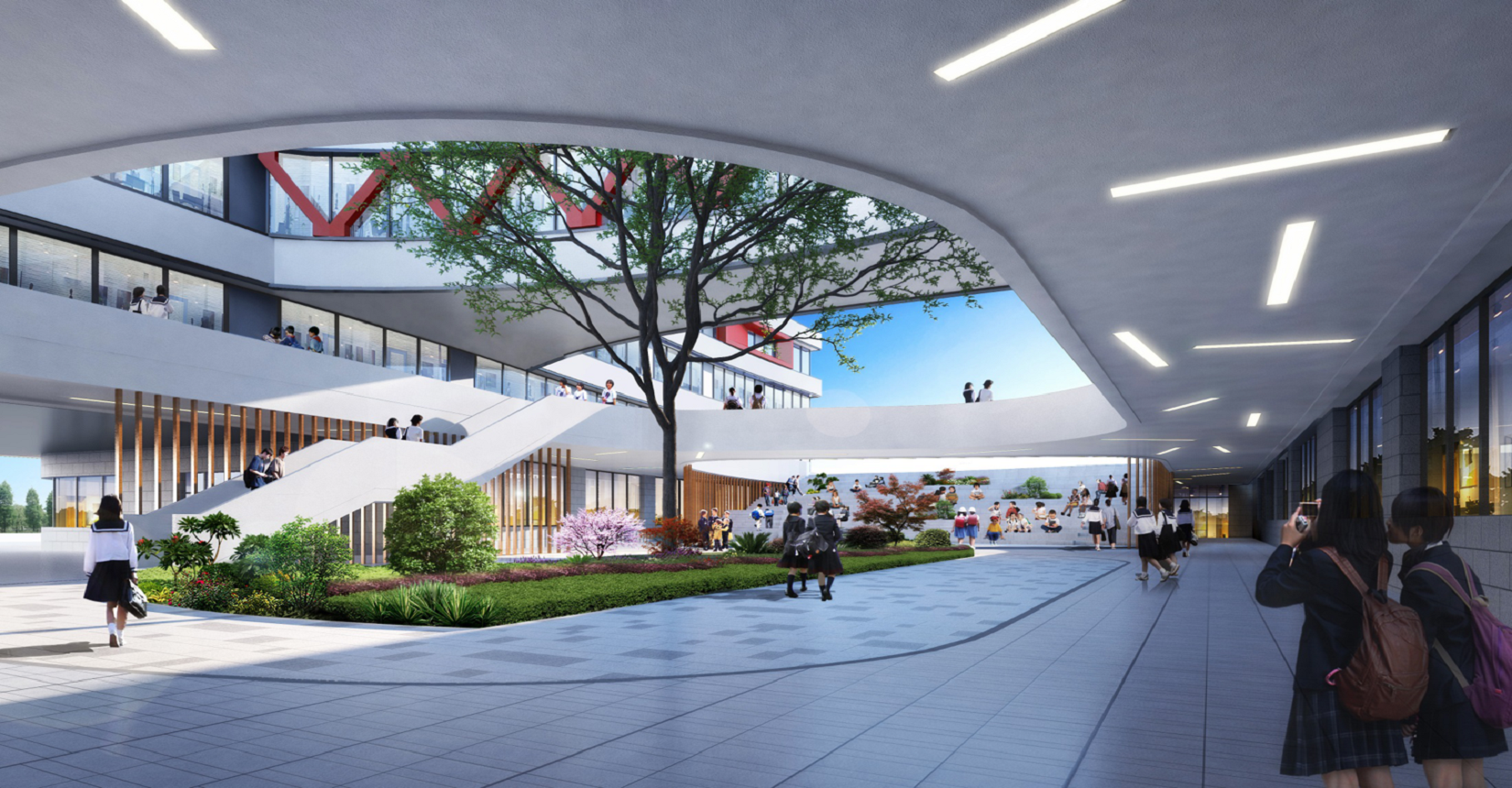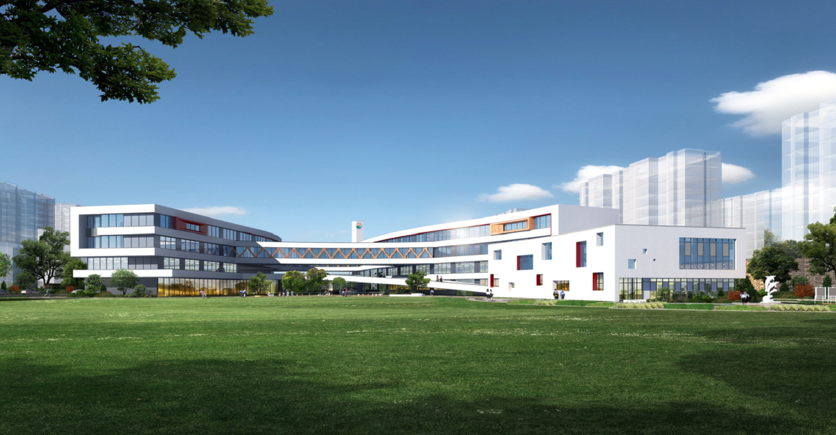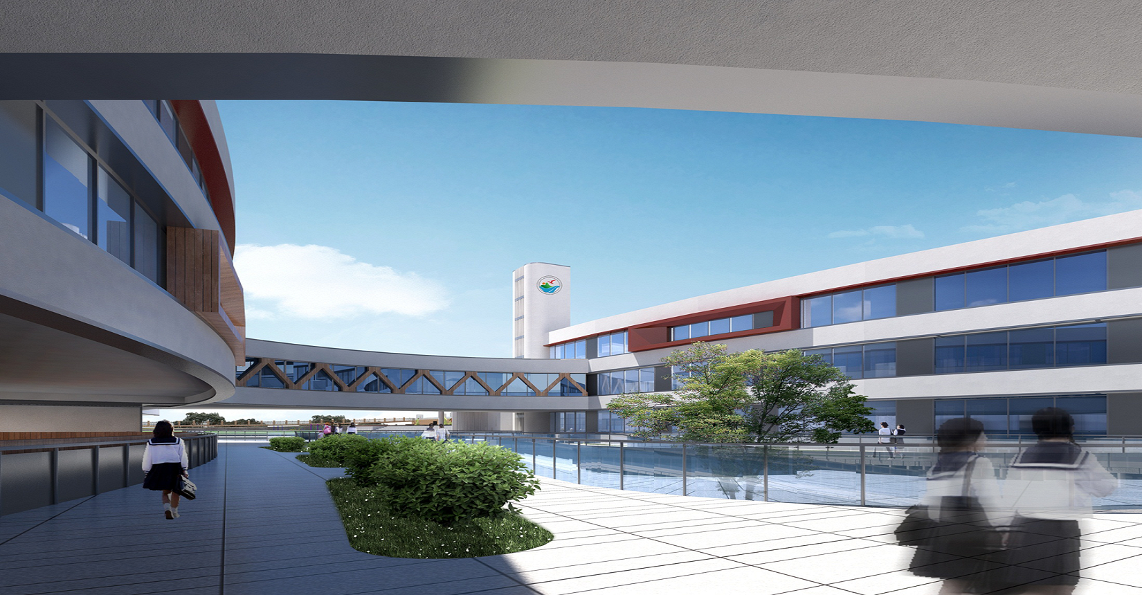 校園規(guī)劃采用曲線手法,營(yíng)造流水姿態(tài),將東側(cè)山脈與西側(cè)河流連接在一起。設(shè)計(jì)現(xiàn)代化“山水”校園,使學(xué)生在自然中成長(zhǎng)。營(yíng)造活水發(fā)源的“源頭”意境,寓意教育為人類(lèi)文化長(zhǎng)河的源頭,呼應(yīng)學(xué)校“源頭”文化。曲線舒展的形體,整體采用白色色調(diào),局部以紅黃色進(jìn)行點(diǎn)綴,風(fēng)格純潔又不失活潑。